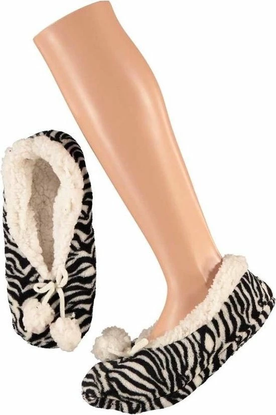 Dames ballerina pantoffels/sloffen zebra zwart/wit maat 40-42. Zwart/witte huissloffen/pantoffels met zebraprint en aan de binnenkant een zachte chenille voering. De slofjes zijn voorzien van twee decoratie pompoms. Materiaal: 100% polyester. Geschikt voor volwassenen.