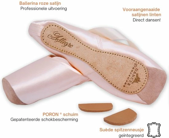 In jouw spitzenpakket zitten alle accessoires die je nodig hebt. Denk hierbij aan spitzenlint, spitzenneusjes en fishnet elastiek. Bij dit model spitzen is op een geavanceerde manier een stukje suède geïntegreerd. De suède fungeert als bescherming en voorkomt uitglijden. Dit zorgt voor een professioneler resultaat bij het dansen. De meegeleverde Poron® teenbescherming wordt los bijgeleverd om de druk op de tenen op te vangen.