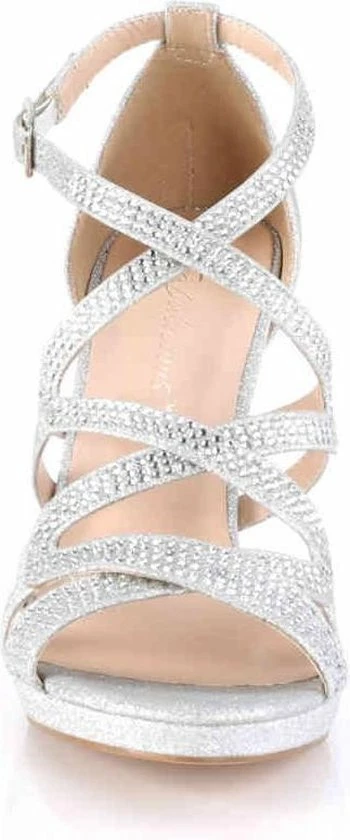 4 (95mm) Stiletto Heel, 2/5 (10mm) Platform Close Back Criss Cross Ankle Strap Sandal Featuring Rhinestone Studded Upper — Materiaal: Kunststof – Polyurethaan – Stof – Rubber