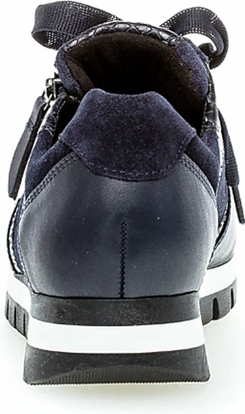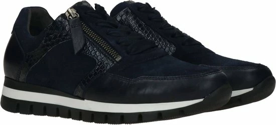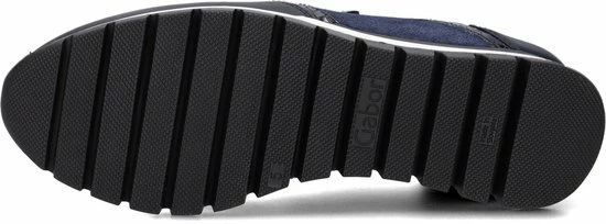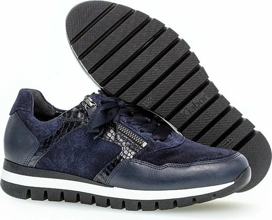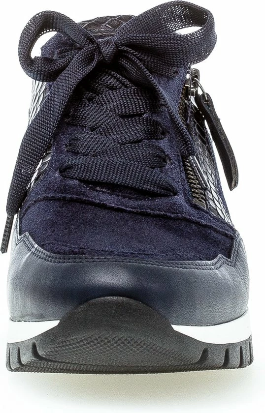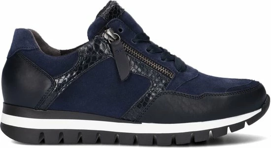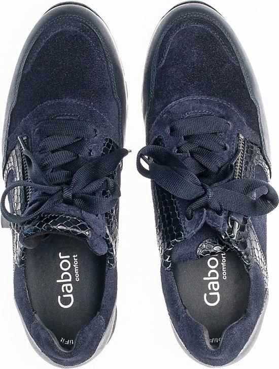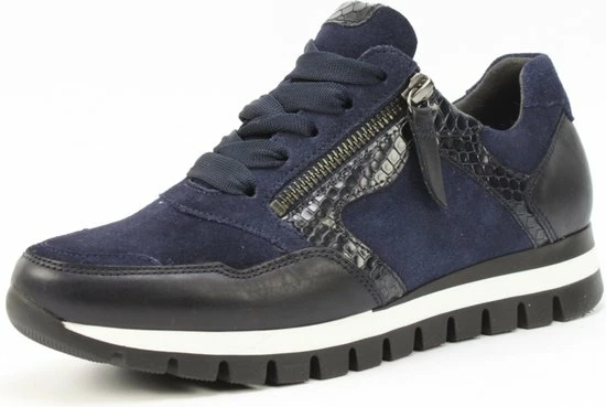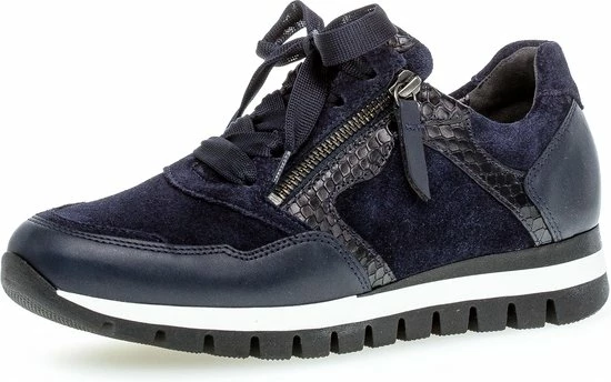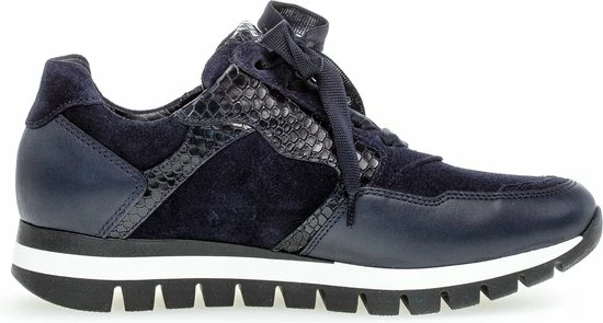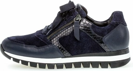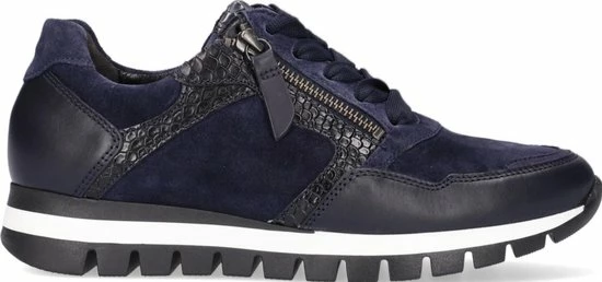 Ga fAshionable op stap met deze blauwe lage sneaker 438 uit de Comfort collectie van het merk Gabor. Schoenen uit de Comfort collectie hebben meer ruimte bij de tenen en bij de bal van de voet en bieden voor iedere voet de noodzakelijke ruimte. De buitenkant is gemaakt van blauw suède en heeft sportieve overlays van leer in combinatie met krokodillenprint accenten. Het binnenwerk heeft een leren voering in combinatie met textiel en een uitneembaar voetbed. Dit model heeft een vetersluiting met een brede veter én een rits langs de veterklep voor een gemakkelijke instap. Opvallend is de wit-zwarte rubberen zool met grof profiel voor een trendy look en een stevige grip.