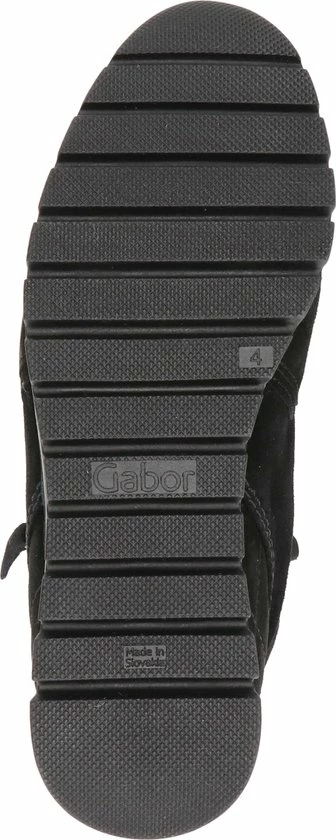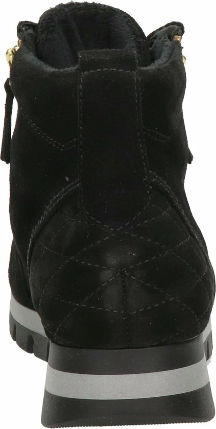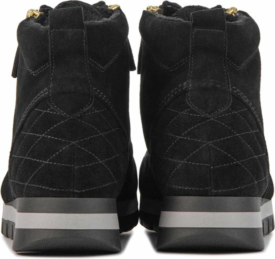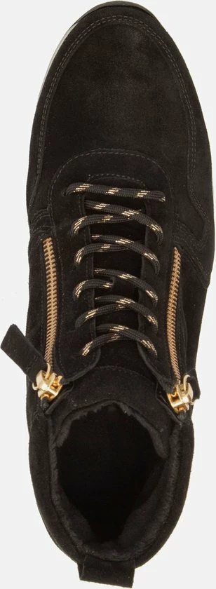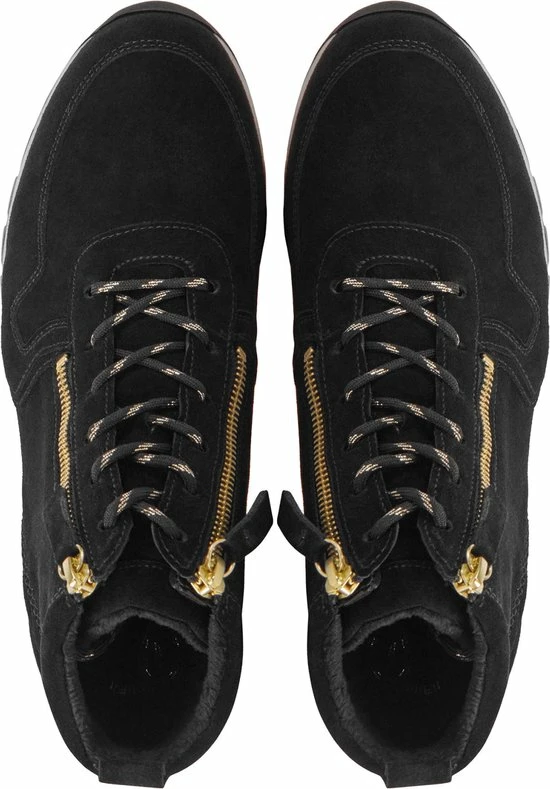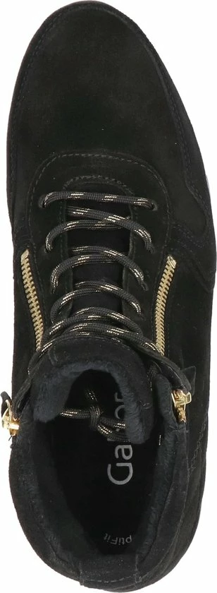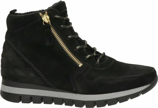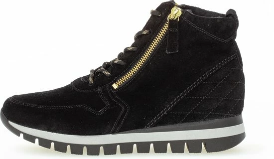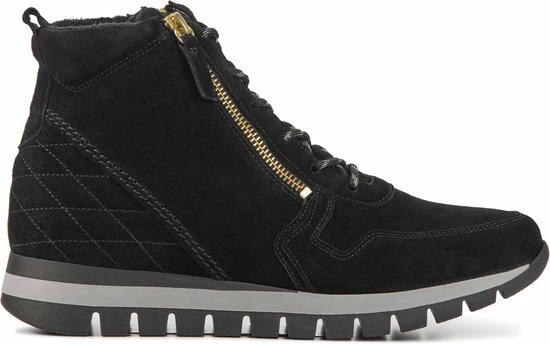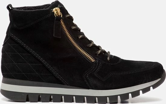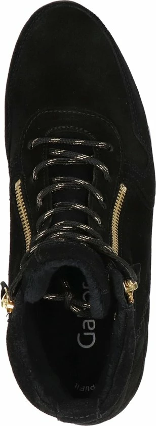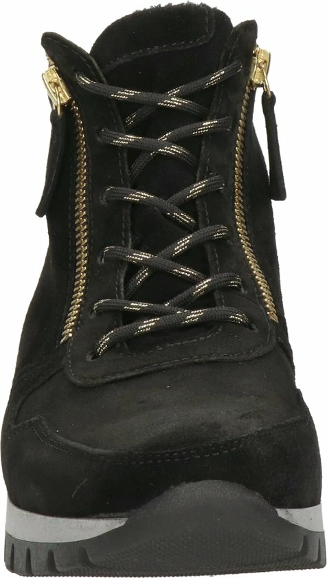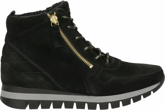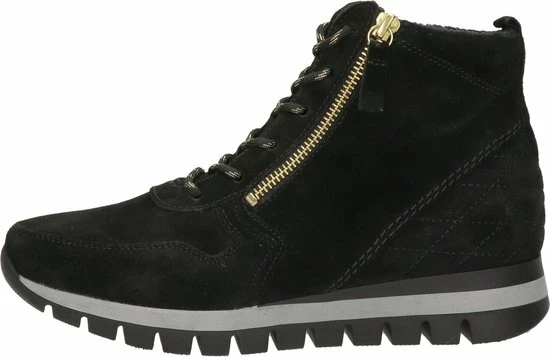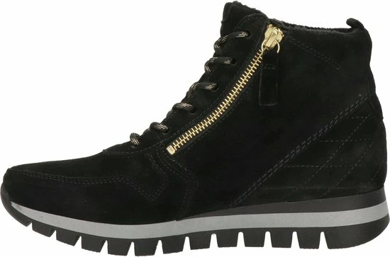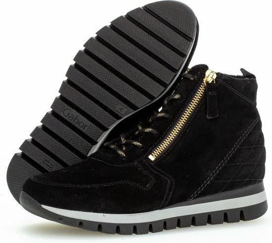 Hoge veterschoen met rits voor dames van het merk Gabor. Deze hoge sneaker is uitgevoerd in zwart suède . Naast de veters bevinden zich twee ritsen om het aan- en uittrekken te versoepelen. De binnenkant is uitgevoerd in vacht en een stevig contrefort draagt bij aan het loopgemak. Het uitneembare voetbed is te vervangen door een persoonlijke inlegzool. De rubberen zool heeft een grof profiel voor stevige grip.