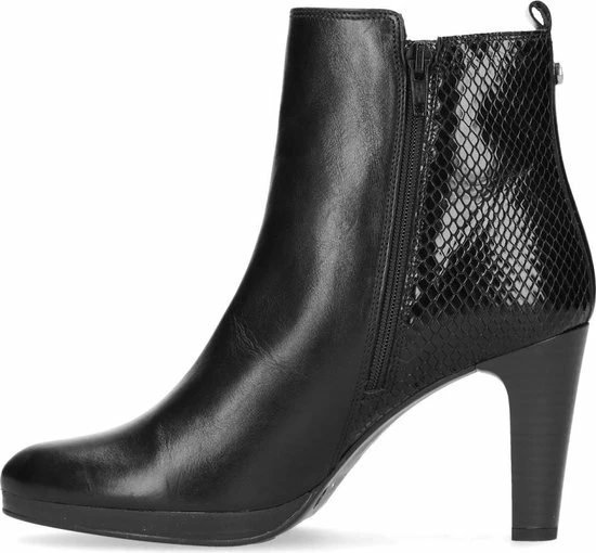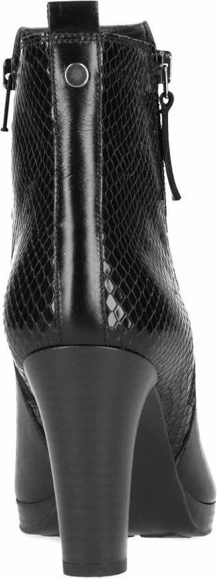 Zwarte enkellaarsjes met hak van het merk Manfield. Een goed paar enkellaarsjes is onmisbaar in je schoenencollectie! Dit zwarte model heeft een binnen- en buitenzijde van leer. De hiel is voorzien van een subtiele snakeskin motief. Je sluit de laarsjes eenvoudig met de ritssluiting aan de binnenzijde van de schoen, de buitenzijde is voorzien van een decoratieve rits. De hakhoogte is 8,5 cm, gemeten vanaf de hiel.
