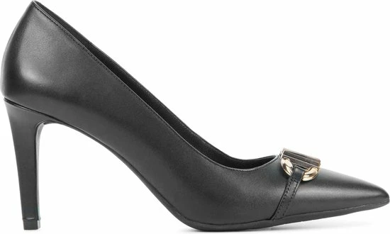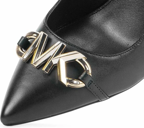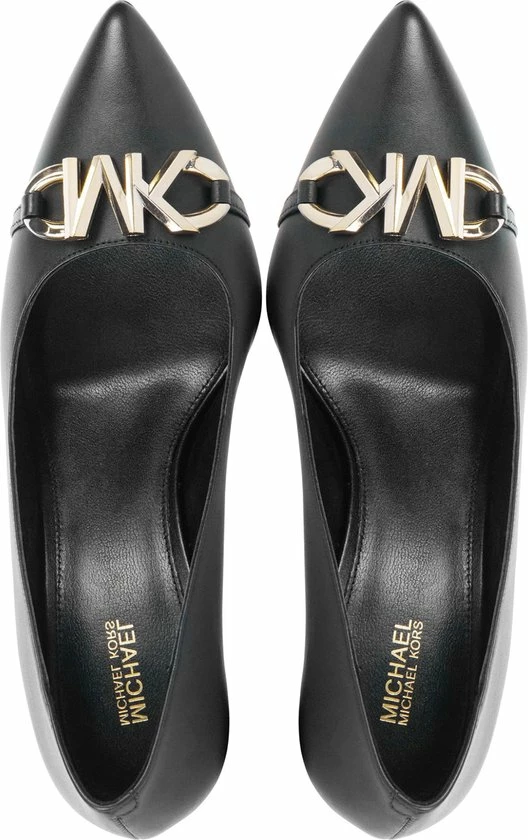 Damesschoen model Izzy flex pump in de kleur zwart van Michael Kors Pasvorm Dit model van Michael Kors valt normaal op maat Beschrijving Pump met logo voor dames van het merk Michael Kors. Deze zwarte pump is uitgevoerd in leer. Op de voorvoet bevindt zich een goudkleurige decoratie met de letters MK verwijzend naar het merk. De binnenkant is uitgevoerd in leer en een suède contrefort draagt bij aan het loopgemak. De beklede hak meet circa 9 cm en de rubberen zool heeft een medium profiel voor stevige grip