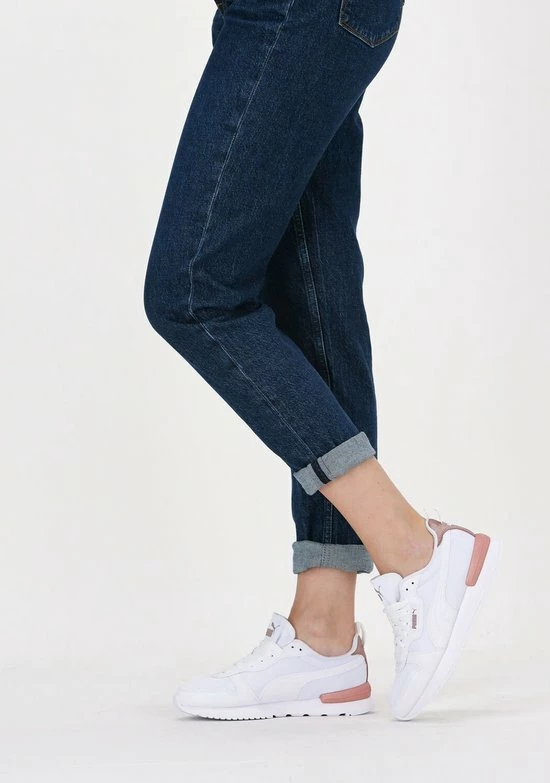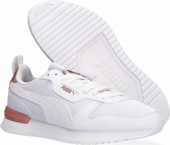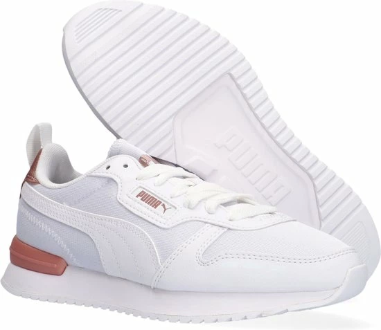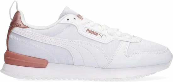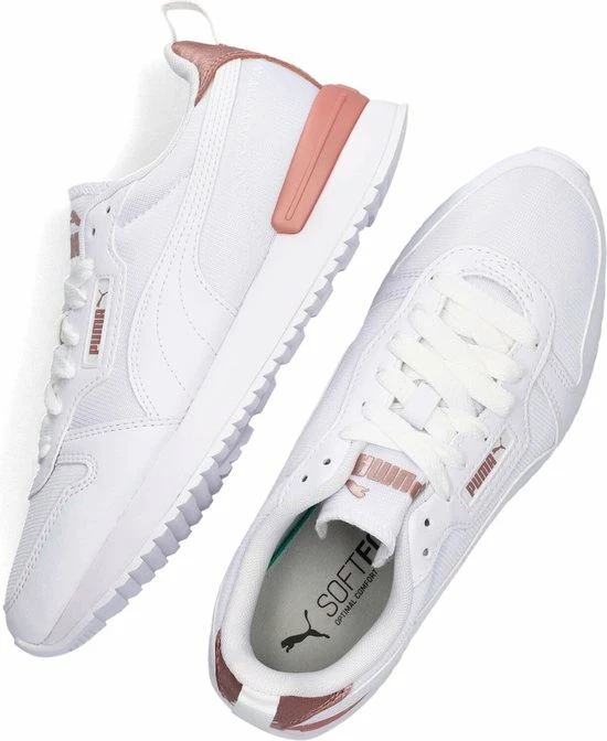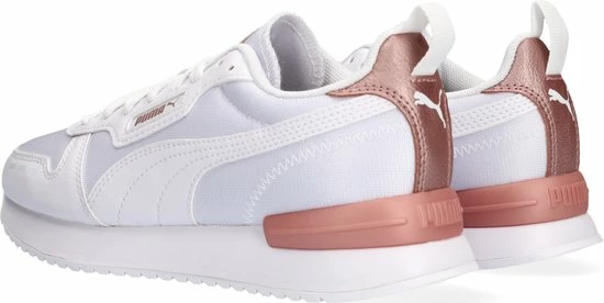 Deze witte lage sneaker Puma R78 WNS Metallic POP is van het merk Puma en heeft een mooi design! Je kunt ‘m overal bij dragen en hij zit superlekker! Dit model is gemaakt van mesh textiel in combinatie met lederlook panelen. De schoen heeft opvallende details zoals de metallic rosé kleurige merkopdruk op de tong en op de hielcap, de roze hielsabilisator met merkreliëf, het vensterlogo op de zijkant en het golvende Puma-stripe logo. Trek de schoen gemakkelijk aan en uit met het handige textiele aantreklusje op de hiel en de vetersluiting. Het binnenwerk is van mesh en heeft een uitneembaar, textiel Soft Foam-voetbed voor optimaal comfort. De zool is onder de voorvoet 1,5 centimeter dik en loopt naar achteren toe op tot bijna 3 centimeter onder de hiel. Combineer ‘m onder een toffe jurk of een 7/8 jeans met de pijpen iets opgerold, zodat jouw Puma’s lekker opvallen!