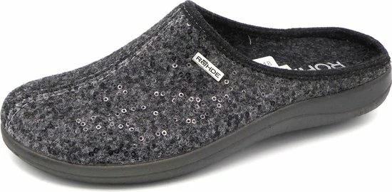 Rohde dames pantoffel slipper model 6550 is gemaakt van een hoogwaardig vilt met pailletten motief en een zachte binnenvoering. De inlegzool is vervangbaar door een eigen voetbed. De pantoffel valt normaal en heeft een vlakke rubberen loopzool.