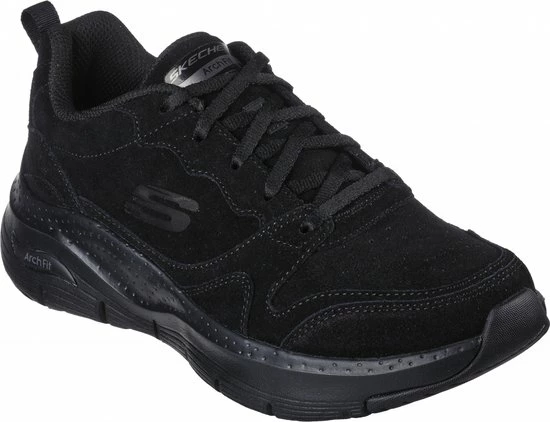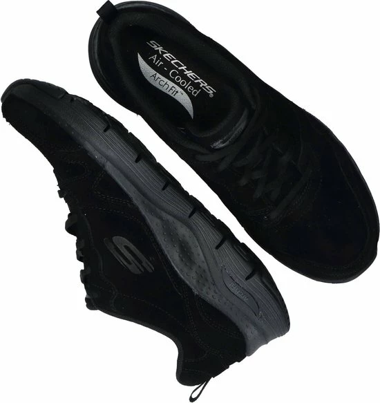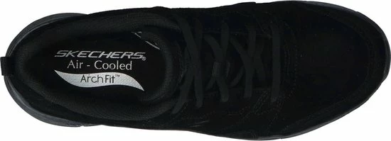 Deze sportieve zwarte sneaker van het merk Skechers heeft een bovenwerk van suède en een binnenzijde gemaakt van textiel. De zool van de schoen is gemaakt van kunststof en de hiel is verhard voor extra stevigheid. Het voetbed van de sneaker is uitneembaar, gevormd en gepolsterd voor optimaal comfort. In dit voetbed is gebruik gemaakt van de aircooled archfit, wat ervoor zorgt dat de druk die op je voet komt geleidelijk over je voet wordt verdeeld. Hierdoor zit de schoen super comfortabel. De schoen is voorzien van een vetersluiting.
