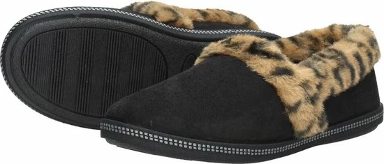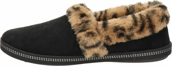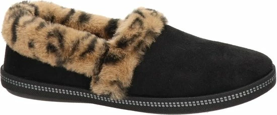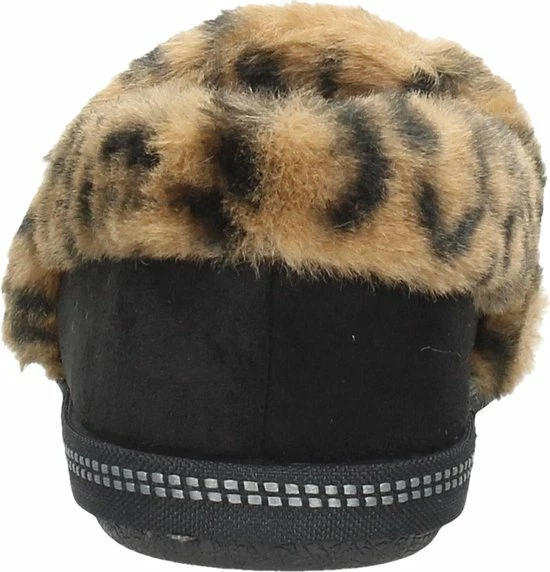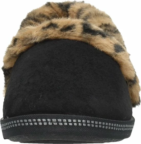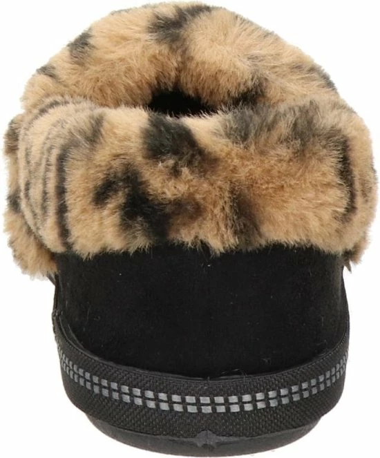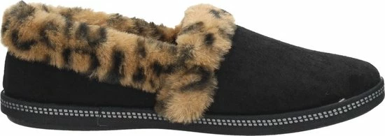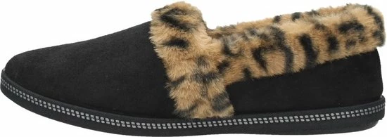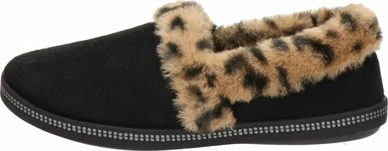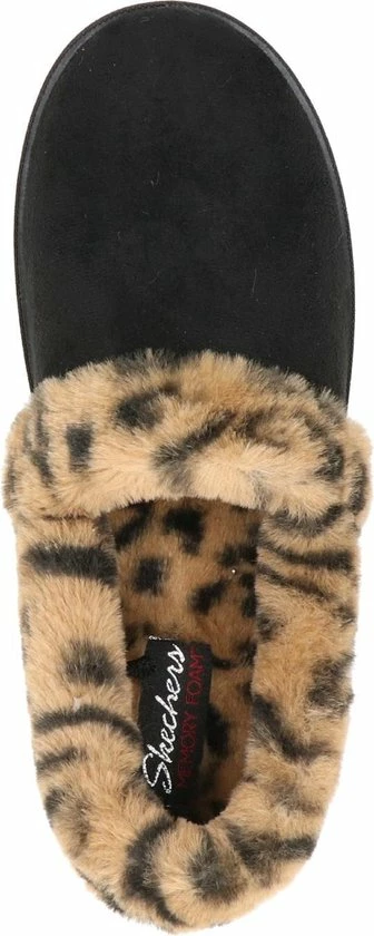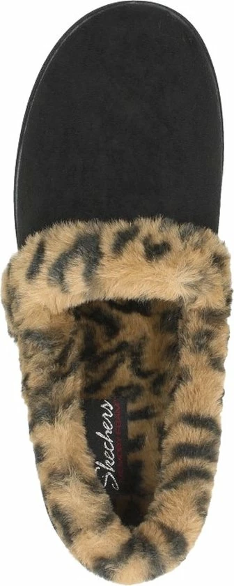 Zwarte Skechers pantoffels gemaakt van suède, met een voering en binnenzool van imitatiebont. Het bont is voorzien van een luipaardprint, wat de pantoffels een leuk effect geeft. Ter decoratie zijn er stiksels aangebracht. Het voetbed is voorzien van Memory Foam. Dit zorgt voor demping. De rubberen zool heeft een dikte van 1 centimeter.