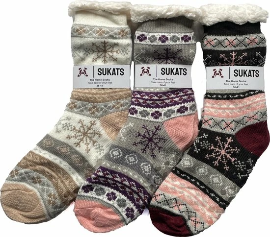 Heb jij ook altijd last van koude voeten en ben jij op zoek naar comfortabele huissokken? Dan hoef je niet verder te zoeken. Deze set van 3 paar huissokken voorziet in die wens. De met pluche gevoerde winter sokken van Sukats zijn heerlijk zacht en zorgen ervoor dat je warme voeten krijgt zonder dat ze gaan zweten. Dat komt omdat het niet van wol gemaakt is maar van acryl. De fleecevoering laten je voeten ademen in tegenstelling tot bij de traditionele huissokken.