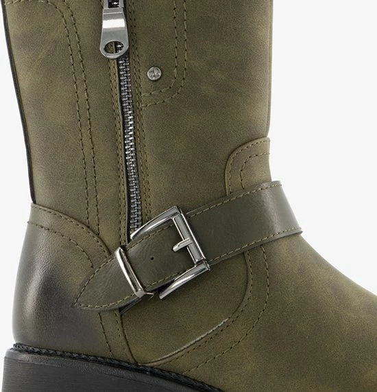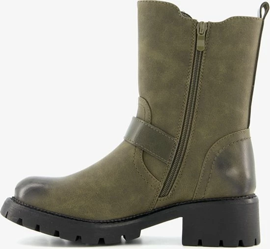 Donkergroene bikerboots van Supercracks. Gemaakt van imitatieleer, een binnenwerk van textiel en een stevige profielzool. De boots hebben een binnenzool van textiel, deze is niet uitneembaar. Voorzien van een decoratieve gesp rondom de enkel en een decoratieve rits aan de buitenzijde. Voorzien van ritssluiting aan de binnenzijde en een aantreklusje. De schachthoogte is 18 cm. De hakhoogte is circa 3 cm.