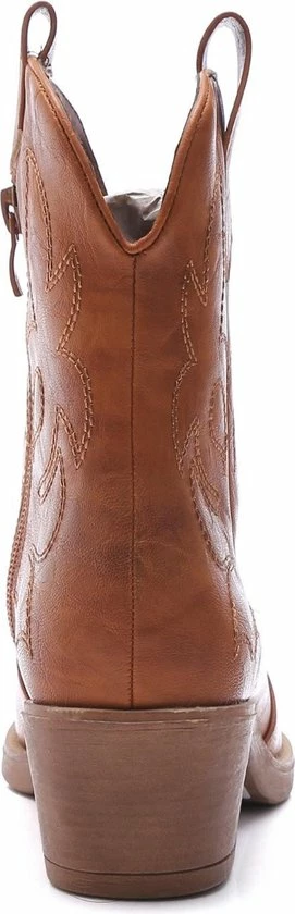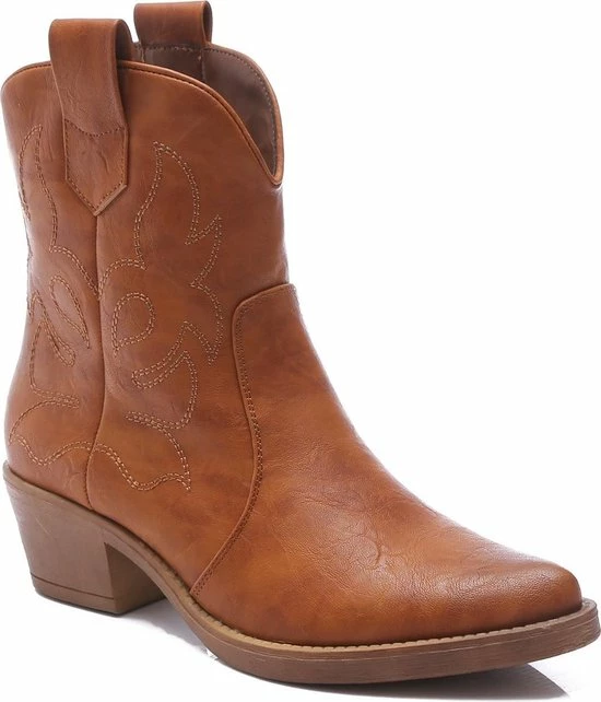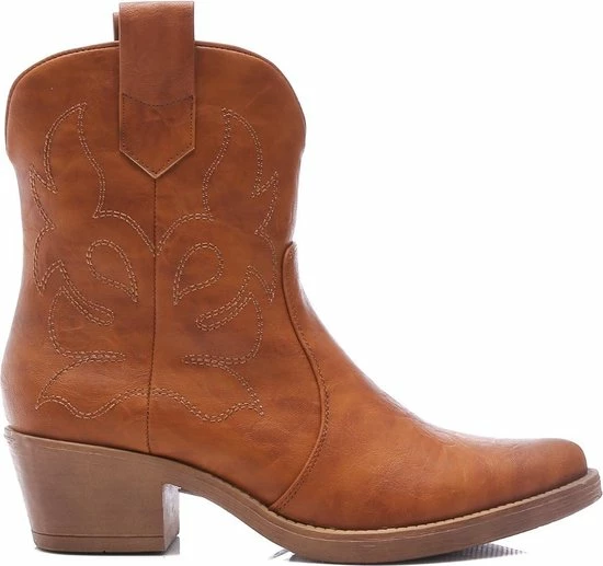 Camel korte imitatieleren cowboylaarzen voor dames. Laarzen met stiksels afgewerkt met bruine zool. Verkrijgbaar in maat 36 t/m 41. Instaprits aan binnenzijde.
